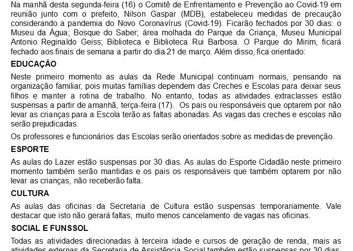 Prefeitura informa novas medidas de prevenção ao Covid-19